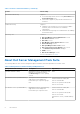 Table 17. Dell Tasks Using Dell Server (In-band) (continued) Task Description Force Power Off Turns off the system power without shutting down the operating system. Power Cycle Turns off the power, and after a delay, turns it on again. Power Off Gracefully Shuts down the operating system first, then turns off the system power. Power On Turns on the system power. This option is available only if the system is off. Power Reset Turns off the system power and turns it on again.