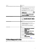 Tabla 18. Tareas de Dell usando el servidor (fuera de banda) de Dell Tarea Descripción Iniciar Dell OpenManage Server Administrator (servidor monolítico) Inicia Dell OpenManage Server Administrator. Iniciar la consola de Dell Remote Access Inicia la consola de iDRAC para los servidores iDRAC detectados fuera de banda. Iniciar Dell License Manager Inicia Dell License Manager en el sistema de administración.