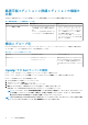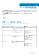 タスク 説明 前のバージョンからのアップグレードを行うときには、この タスクを実行してこの監視機能の最新バージョンを使用して ください。 ダッシュボードの更新 自動的にアップデートされなかった場合に Feature Management Dashboard をアップデートします。 シャーシ監視機能の削除 シャーシ監視機能(拡張可能監視機能および詳細監視機能の 両方)を削除します。 シャーシモジュラーサーバー相関 シャーシモジュラーサーバー相関機能のインポート シャーシモジュラーサーバー相関機能をインポートします。 シャーシモジュラーサーバー相関機能のアップグレード シャーシモジュラーサーバー相関機能の最新バージョンにア ップグレードします。 ダッシュボードの更新 自動的にアップデートされなかった場合に Feature Management Dashboard をアップデートします。 シャーシモジュラーサーバー相関機能の削除 シャーシモジュラーサーバー相関監視機能を削除します。 Dell Feature Management Dashboard 55
