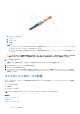 図 1. SAS ケーブルの接続 a. プルタブ b. SAS ケーブル c. SAS ポート メモ: ● コントローラーが正しく取り付けられていることを確認するには、https://www.dell.com/storagecontrollermanuals にあ る RAID コントローラーのマニュアルを参照してください。 ● シングルポート構成、冗長構成、マルチチェーン構成の詳細に関しては、エンクロージャのケーブル配線を参照してく ださい。 注意: エンクロージャを電源の問題から守るには、UPS、ライン コンディショナー、またはサージ プロテクターなどで保 護された PSU に AC 電源ケーブルを接続します。可能であれば、異なる回路に 2 台の PSU を接続してください。 3. PSU を電源に接続します。 メモ: PSU を接続する前に、両方の PSU の電源スイッチがオフになっていることを確認します。 4. PSU または冷却ファンモジュールの電源を入れます。 5. ホストシステムの電源を入れます。 6.