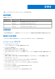 表 1. Storage Manager コンポーネント (続き) 説明 コンポーネント セットアップマニュアル によってロックされたままになりま す。 管理互換性 Storage Manager は、ストレージ製品を管理し、Microsoft 製品および VMware 製品の統合管理を提供します。 Storage Manager には、次の表に示されている製品との互換性があります。 製品 バージョン Storage Center 6.7~7.3 メモ: Storage Manager 2018 R1.10 を使用すると、Storage Center 6.6 を実行しているストレージシステムに接続し、後 でサポートされている Storage Center のバージョンにアッ プデートすることができます。 PS Series グループファームウェア 7.0 ~ 10.0 Dell FluidFS 6.0.300135 メモ: FluidFS ファームウェアを 6.0.