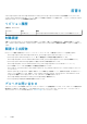 • • • • Name(名前) - 選択した仮想マシンの名前 CPU - 仮想マシンに関連付ける CPU Memory(メモリ) - 割り当てるメモリ容量 Network(ネットワーク) - 仮想マシンに使用するネットワーク ボリューム ボリュームページを使用して、新しい Dell ボリュームの属性を指定します。 • • • Volume Name(ボリューム名) – ボリュームの名前を入力します。 Size(サイズ) – ボリュームサイズを指定します。 Volume Folder(ボリュームフォルダ) – ボリュームのフォルダの場所を選択します。 ボリューム保持 Volume Retention(ボリューム保持)ページを使用して、ボリュームまたは Raw デバイスの削除用の保持オプションを指定します。 ウィザードページのリファレンス 95