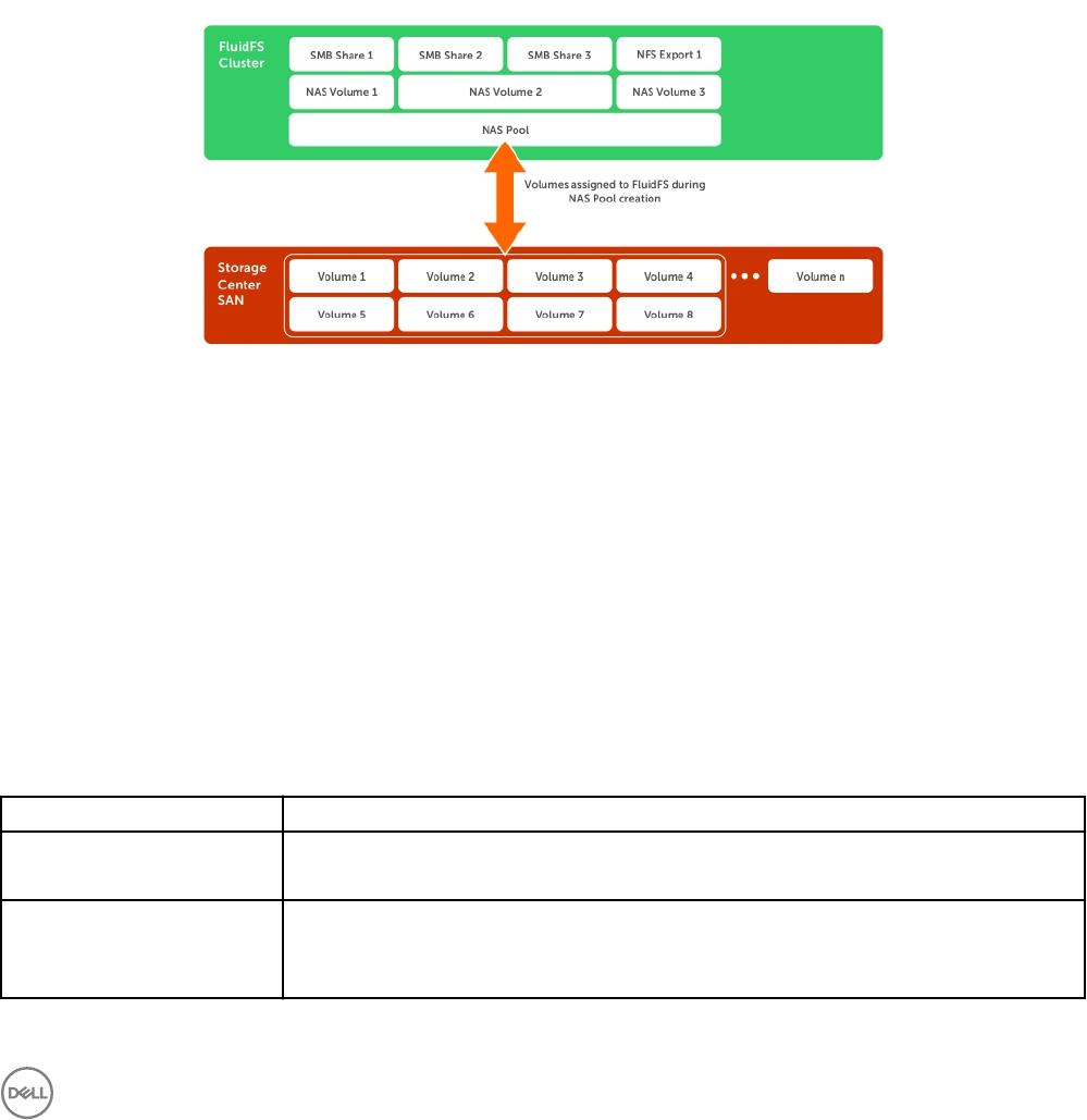 Storage Center は、ある一定の容量(NAS プール)を FluidFS クラスタに提供します。この NAS プールはその後、NAS ボリュームに分割され、