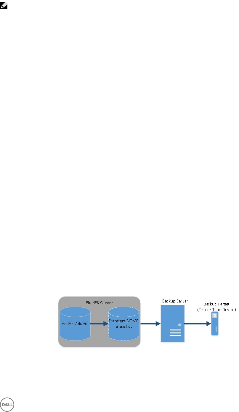 FluidFS クラスタで NDMP を設定した後、NDMP サーバはクライアントネットワークで DMA サーバからのバックアップ要求を監視します。その後、