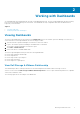 2 Working with Dashboards Several dashboards are prepackaged with the Dell Storage Management Pack. The Dell Storage dashboards provide a starting point for monitoring and analyzing your environment. The dashboards are fully configurable and can be modified to better represent your environment. Topics: • • Viewing Dashboards Modifying Dashboards and Widgets Viewing Dashboards The Dell Storage dashboards are accessed from the Dashboards menu of the vRealize Operations Manager user interface.