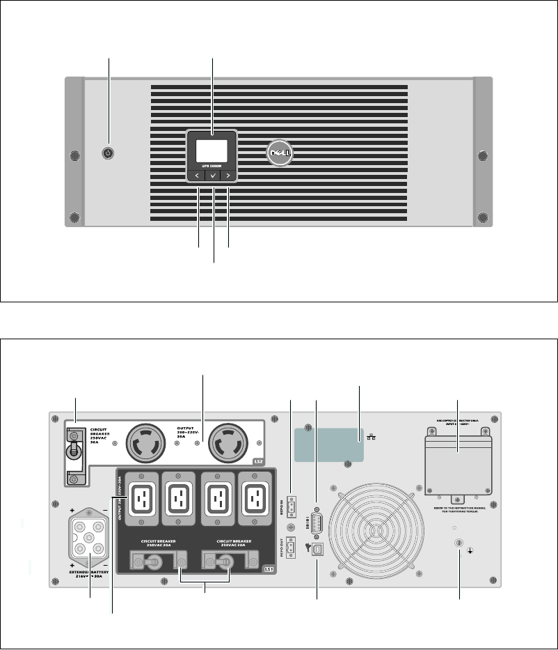 Cette section montre un panneau avant et arrière de l'Onduleur Baie En Ligne Dell.