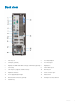 2 Chassis This chapter illustrates the multiple chassis views along with the ports and connectors and also explains the FN hot key combinations. Topics: • Front view • Back view Front view 1 Optical drive (optional) 2 Power button and power light 3 Hard-drive activity light 4 Memory card reader (optional) 5 Headset/Universal audio jack port 6 USB 2.0 port with PowerShare (supports battery charge capability) 7 USB 2.0 port 8 USB 3.1 Gen 2 Type-C port with PowerShare 9 USB 3.