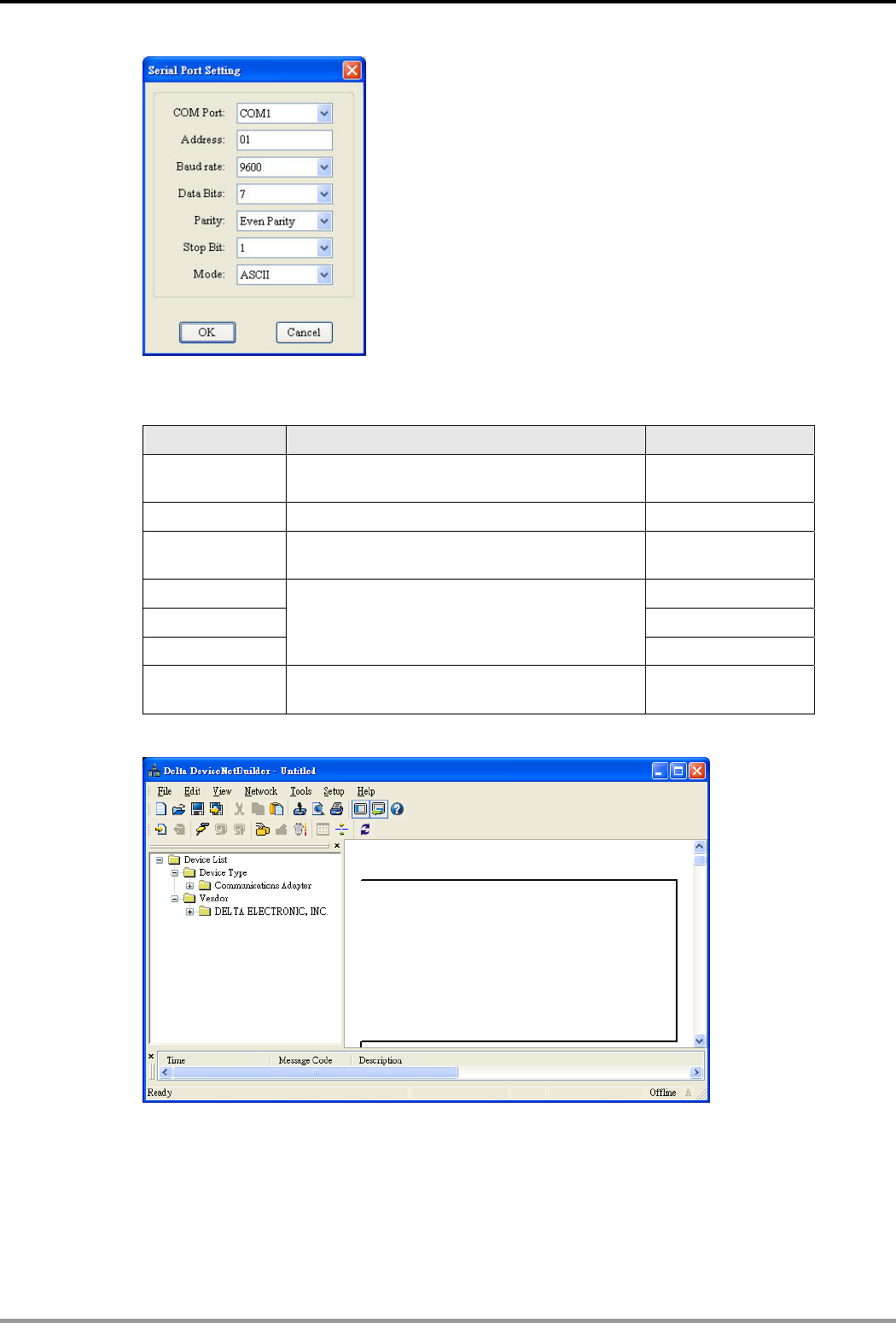 (3) Set up the communication parameters in the PC and DVP-SV, e.g. the communication port, address,