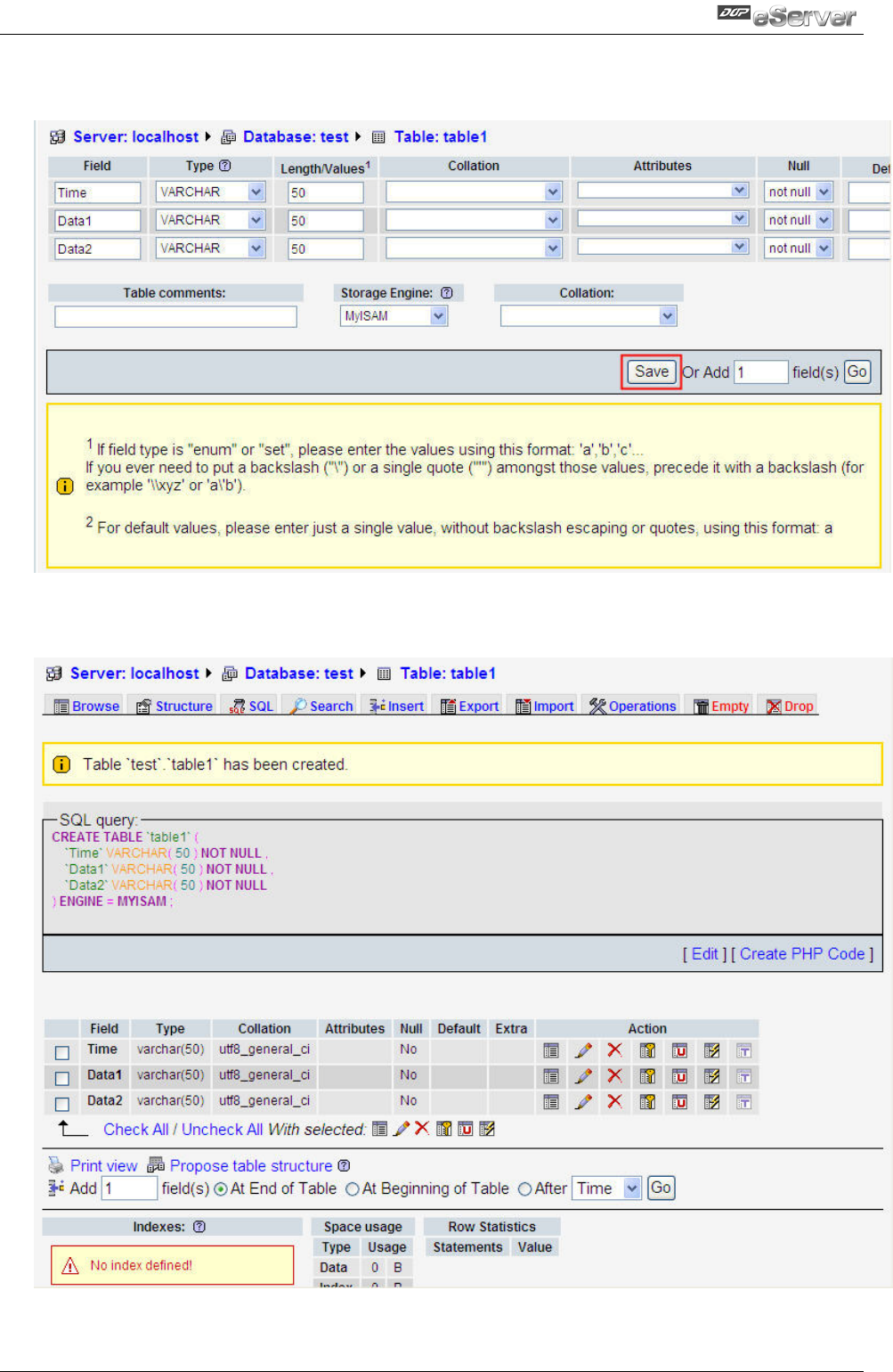 After the table1 has been created, the screen will be shown as follows.