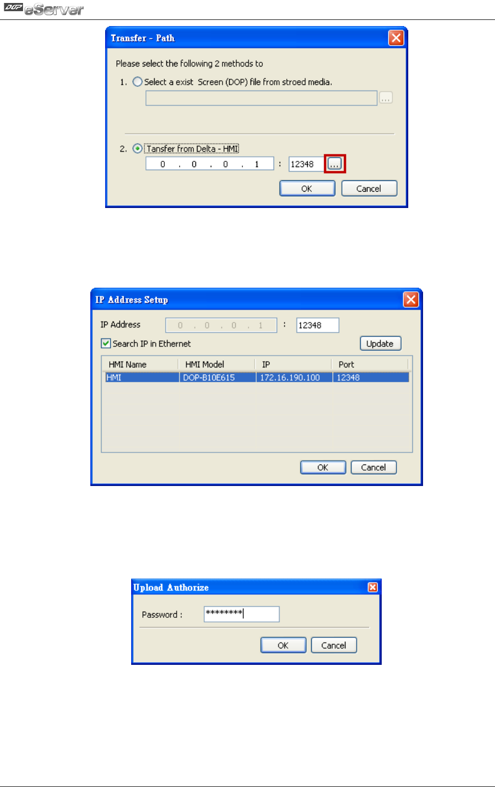 eServer will ask user to input the authorize password to connected with HMI. (The