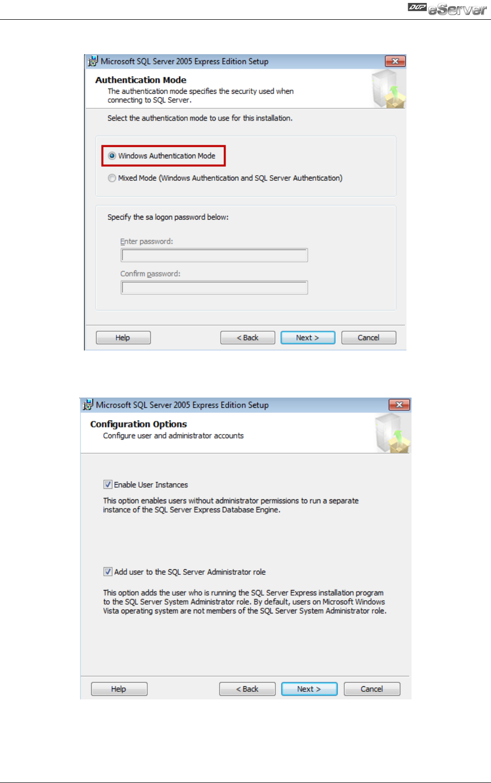 SQL Server Authentication Mode. Select Windows Authentication Mode and click Next.
