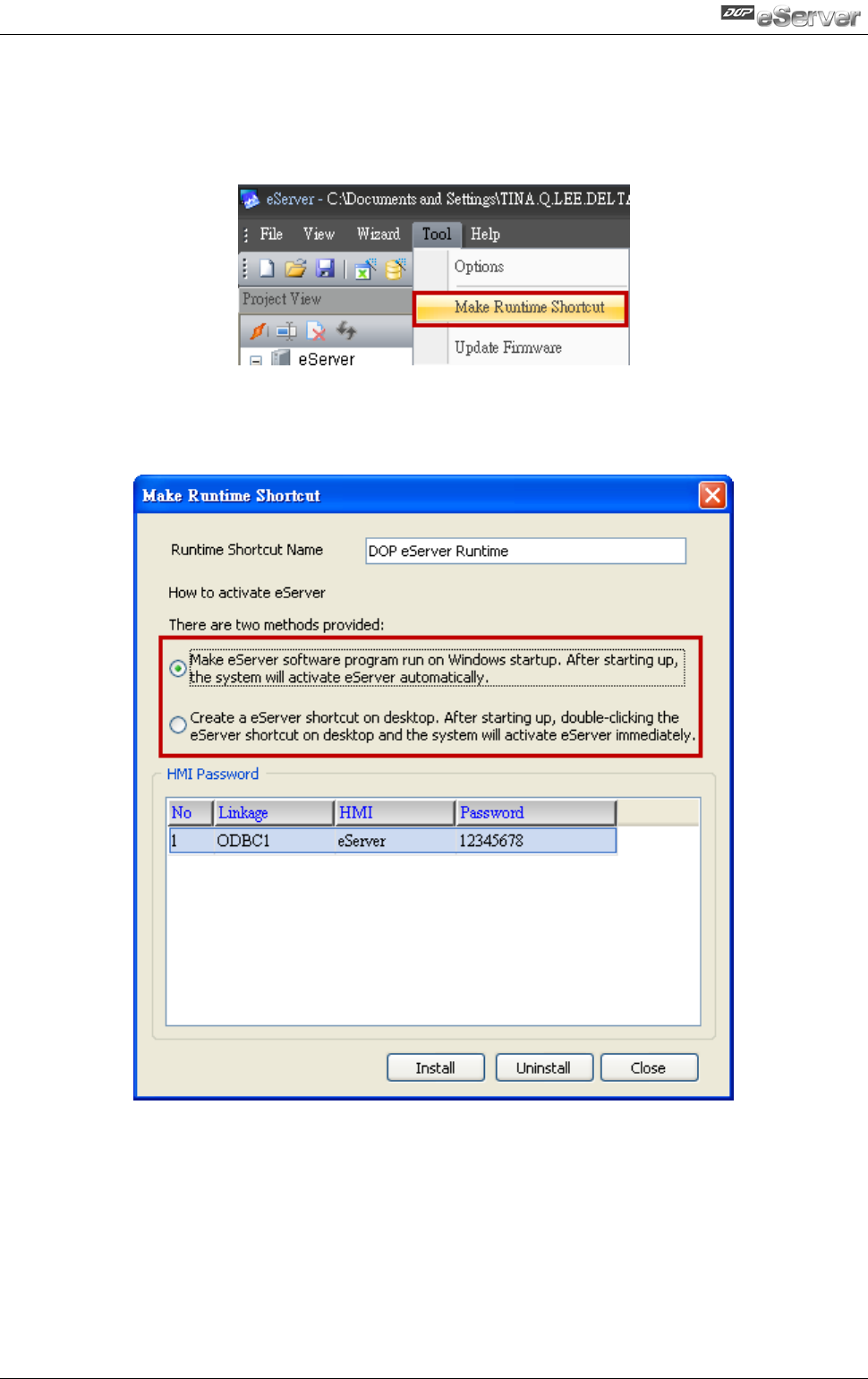 Start eServer and click Tool > Make Runtime Shortcut to create a eServer shortcut and