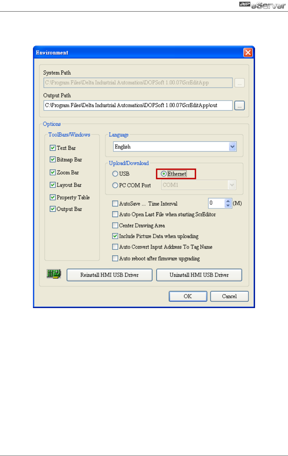 In Environment dialog box, change the default setting of upload and download to Ethernet.