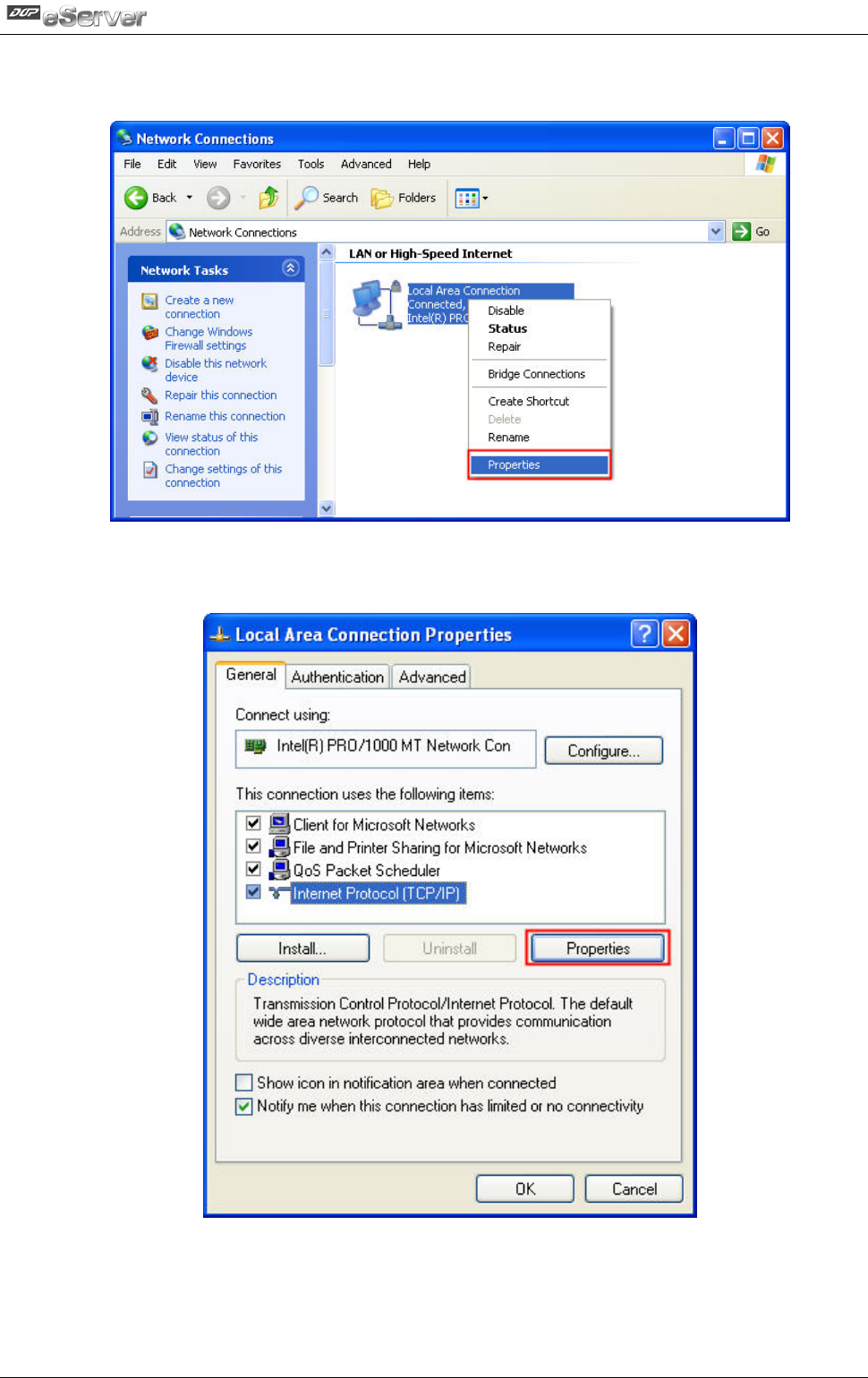 Local Area Connection icon, and then select Properties from the pop-up menu.
