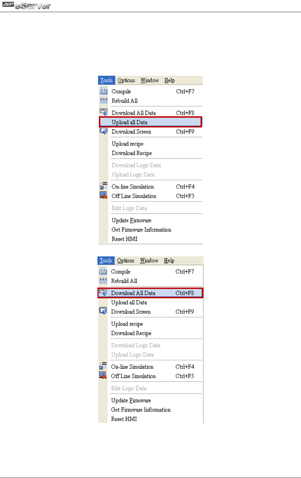 compile operation is performed successfully, choose Upload all Data or Download all Data