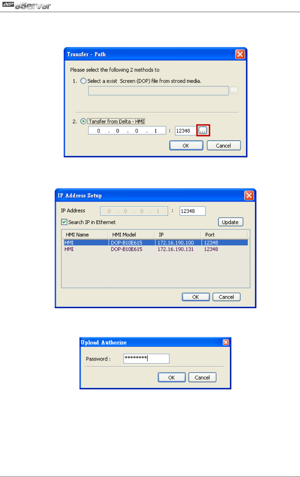 eServer will ask user to input authorize password to upload HMI project. The default
