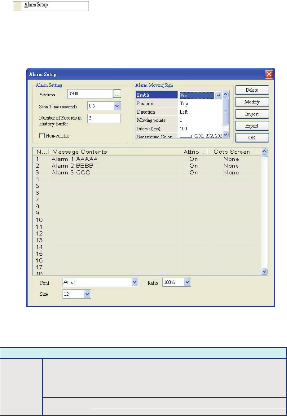 enabled) after setting, HMI will display an Alarm Setup warning dialog box automatically. In this dialog