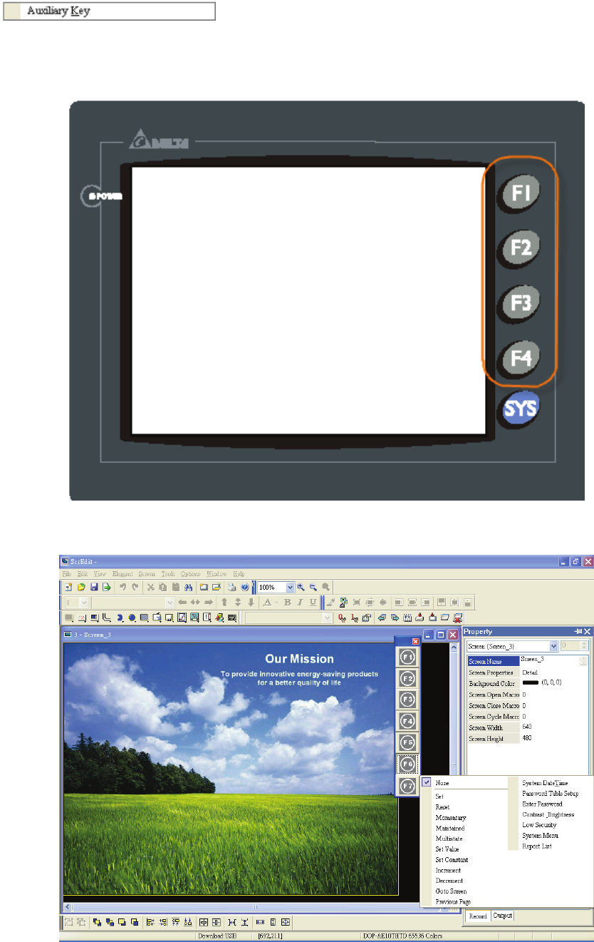 DOP series HMI allows the user to determine the function of auxiliary keys in each screen. The user