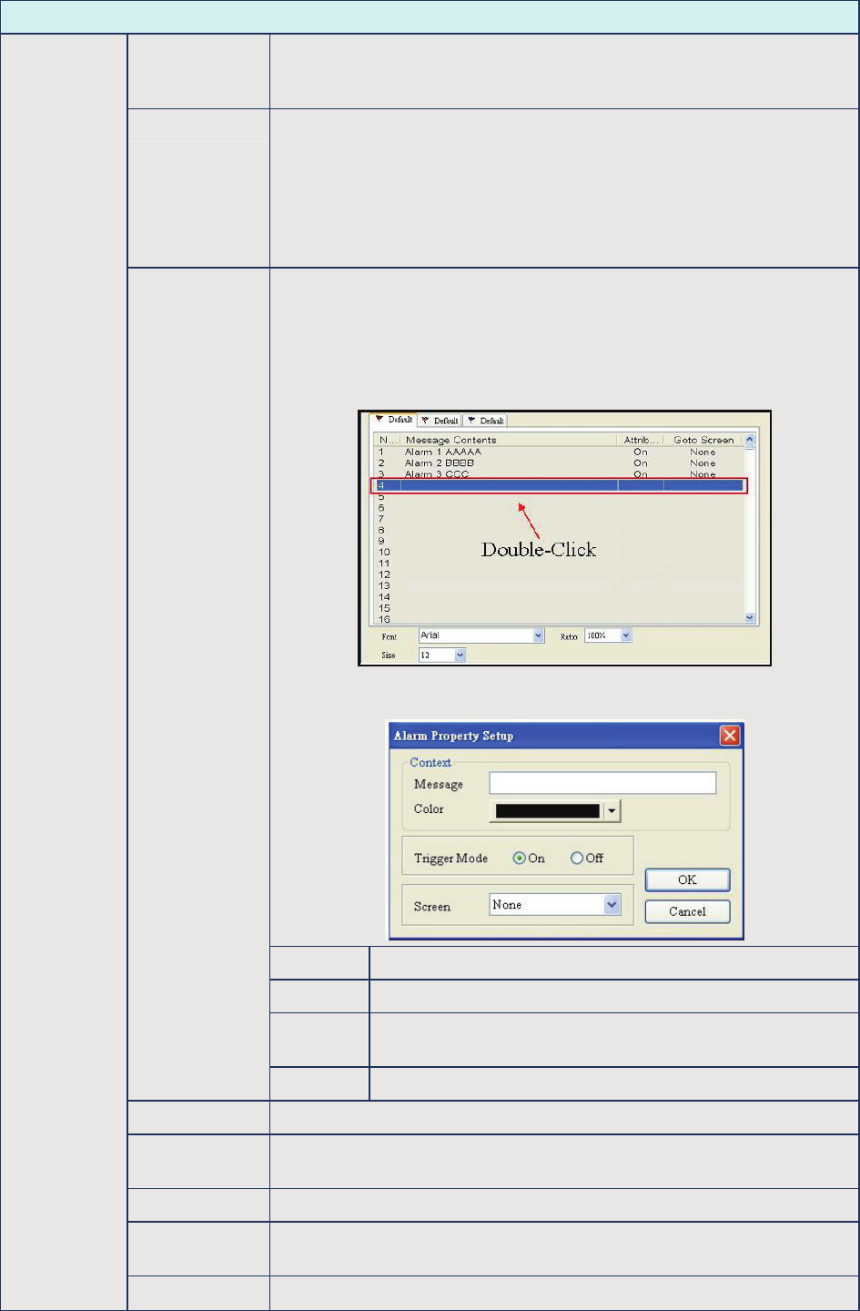 The following Alarm Property Setup dialog box will display after double