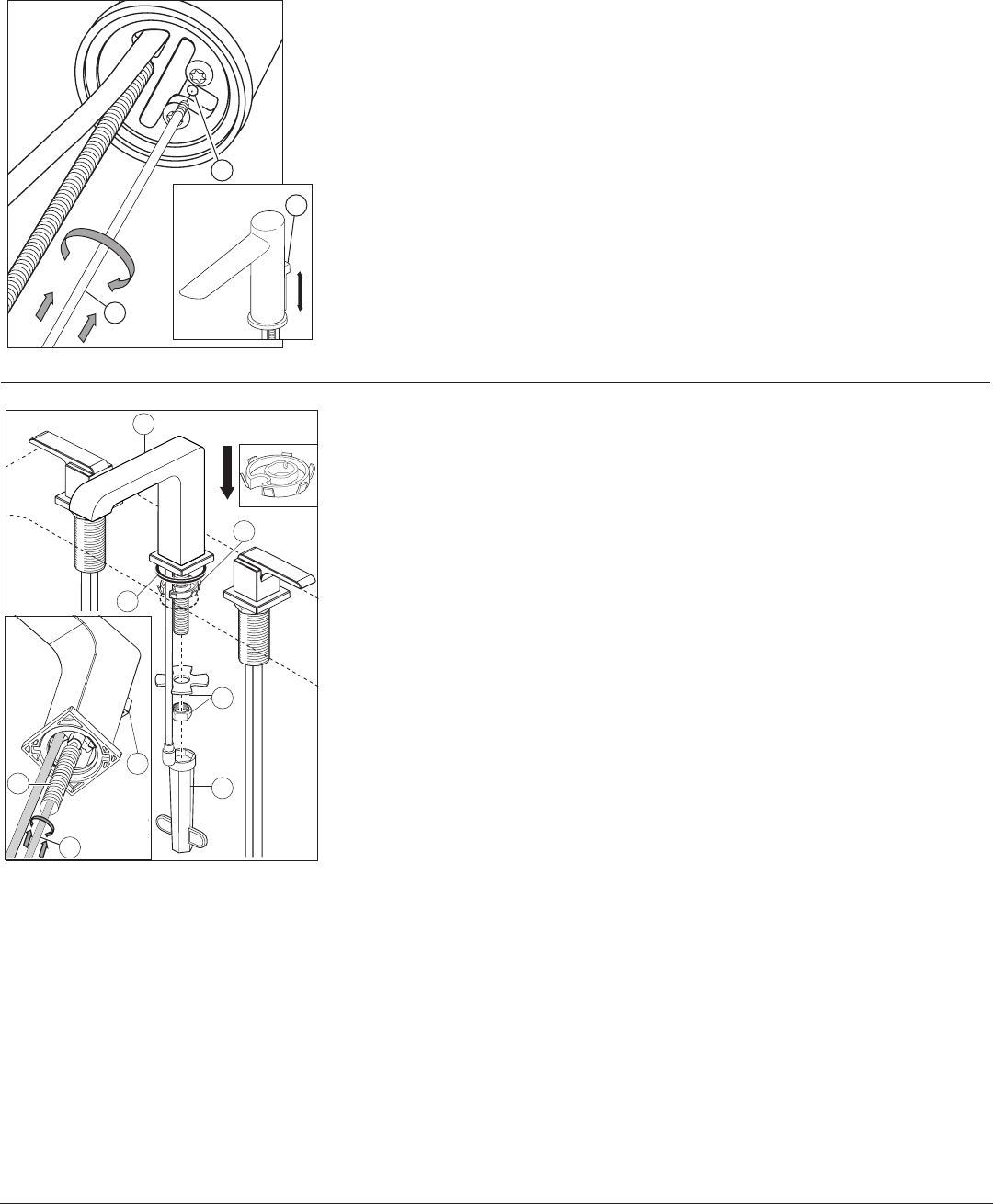 From underneath the spout, thread lift rod (1) through mounting shank (2) until finger tight. Use caution not to