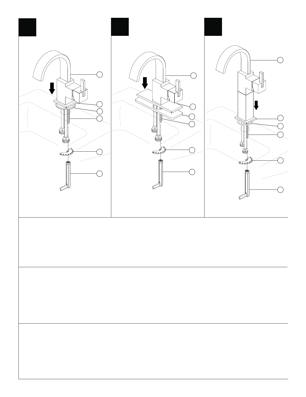 Placez le robinet (1) avec une plaque de finition pour un trou ou trois trous (2) (non fournis) et la plaque de base (3) sur l’évier. Facultatif : si la