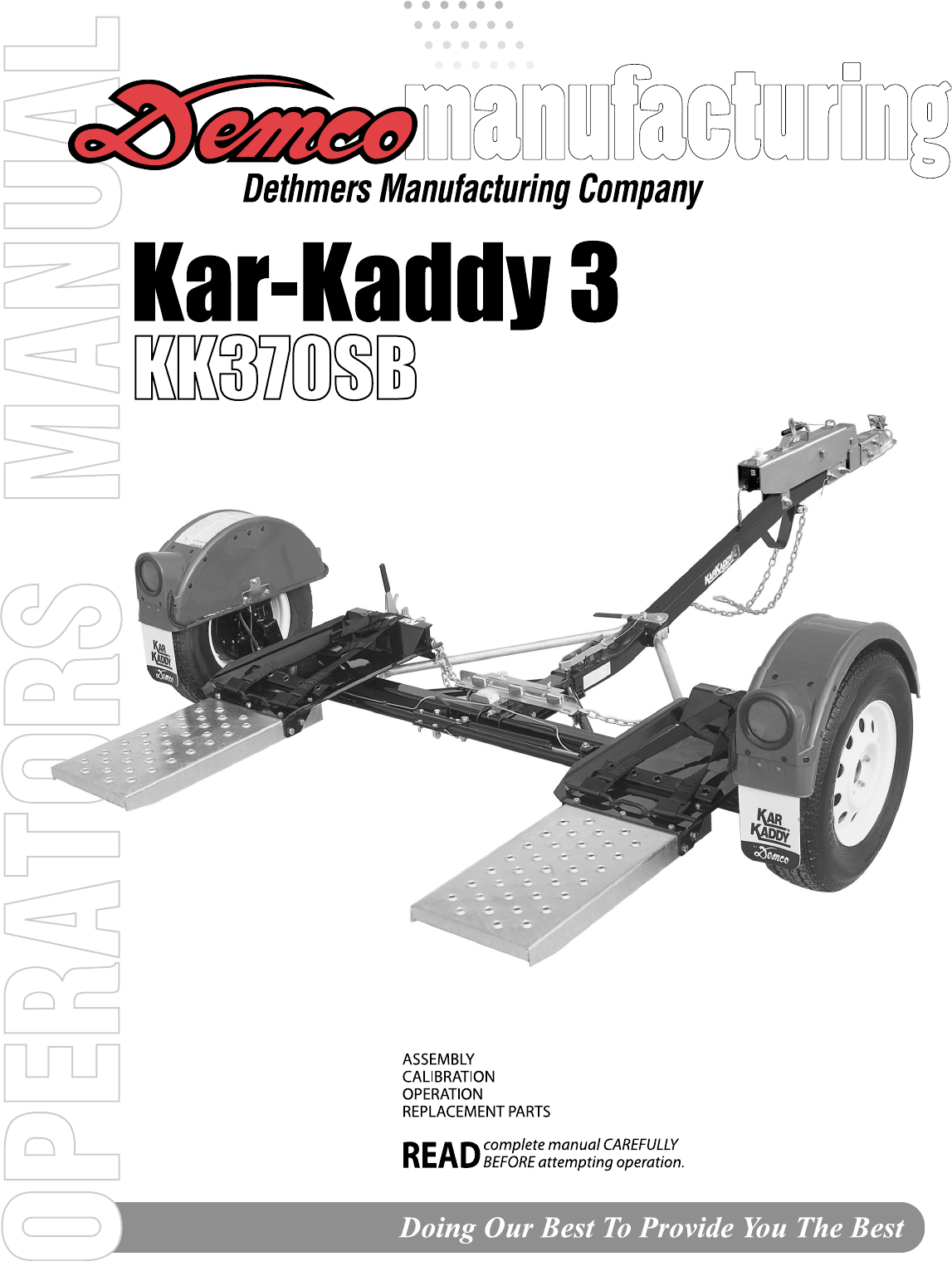 ! WARNING: FAILURE TO FOLLOW THESE INSTRUCTIONS CAN RESULT IN LOSS OF TOWING VEHICLE CONTROL, SEPERATION OF THE TOW DOLLY FROM THE TOWING VEHICLE, SEPERATION OF THE TOWED VEHICLE FROM THE TOW DOLLY, CAUSING SEVERE PERSONAL INJURY, DEATH, OR PROPERTY DAMAGE. ! SAFETY Safety is of utmost importance at all times. There are several items that must be checked each time before using and while using the Kar Kaddy.