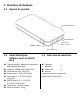 1 Données techniques 1.1 Aspect du produit Témoin d’alimentation Sortie USB QC 3.0 Entrée Micro USB : 5 VCC/2 A MARCHE / ARRET Sortie USB QC 3.0 1.2 Caractéristiques (référez-vous à l’article réel) 1.3 Liste des accessoires ◆ Type de batterie : Batterie en polymère à haute densité d’énergie ◆ Capacité : 20000 mAh/74 Wh (TYP) ◆ Entrée Micro USB : 5 VCC/2 A ◆ Entrée type-C : 5 VCC/2A, 9V/2A ◆ Sortie type-C : 5 VCC/3A, 9V/2A, 12V/1,5A ◆ SORTIE USB QC 3.