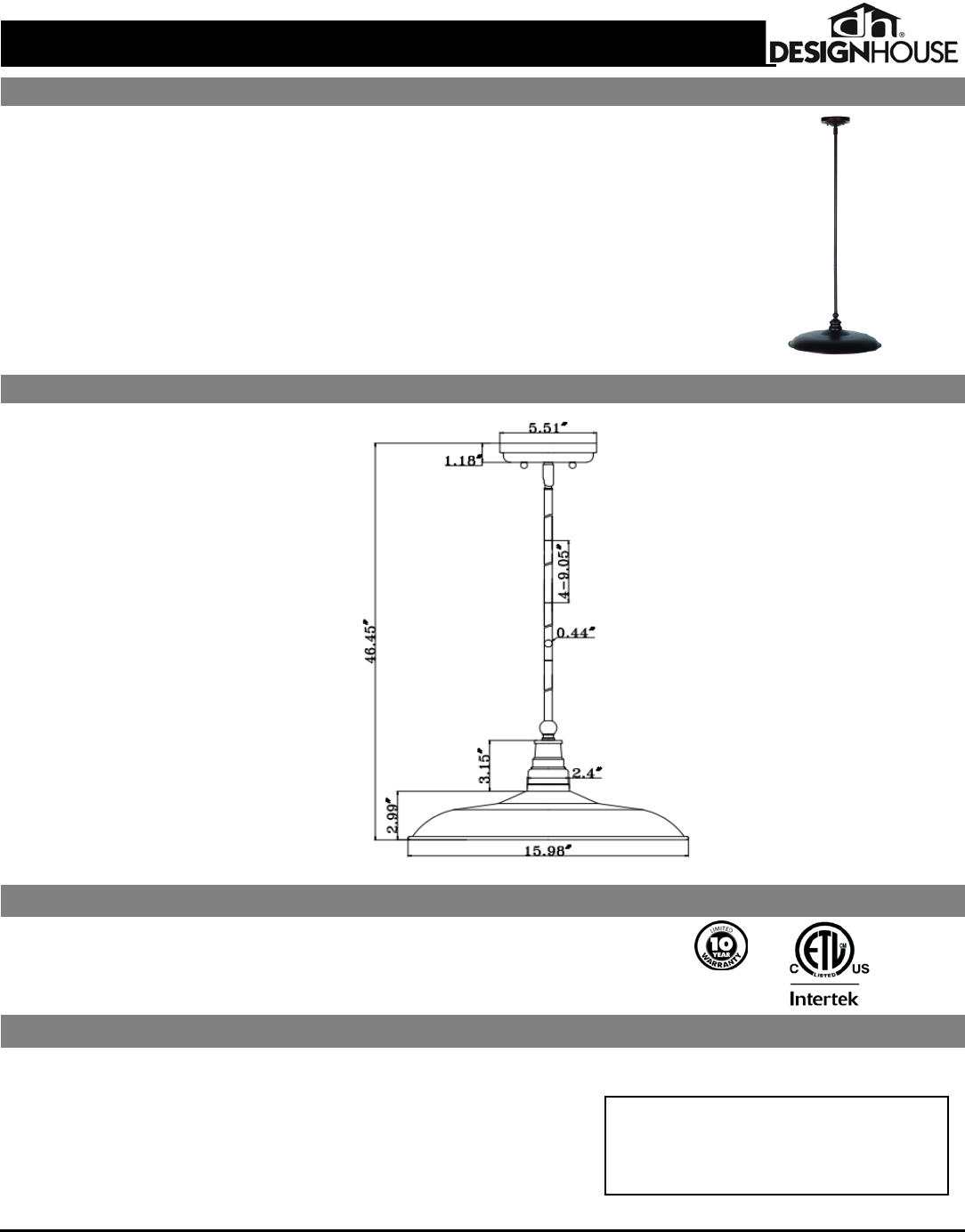 Design House reserves the right to make changes in materials, specifications & models at any time. Design House also reserves the right to discontinue product without notice or obligation.