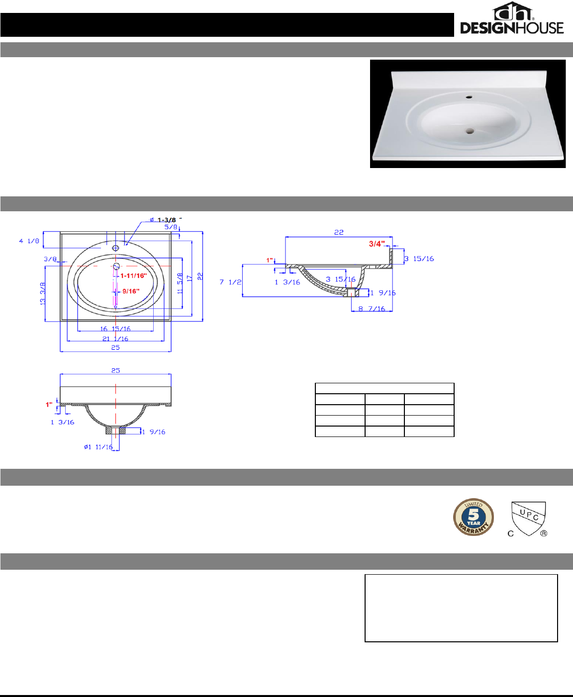 Design House reserves the right to make changes in materials, specifications & models at any time. Design House also reserves the right to discontinue product without notice or obligation.