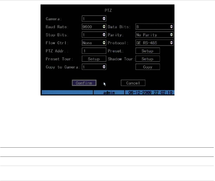 PTZ control. You can define RS-485 settings to match your PTZ protocol such as: