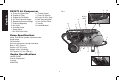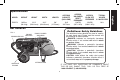 English • Excessive vibration can weaken the air tank and cause rupture or explosion. Excessive vibration will occur if the compressor is not properly mounted or if engine operates above recommended RPM. Attachments & accessories: • Exceeding the pressure rating of air tools, spray guns, air operated accessories, tires, and other inflatables can cause them to explode or fly apart, and could result in serious injury. Tires: • Over inflation of tires could result in serious injury and property damage.