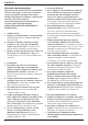 NEDERLANDS Extra veiligheidsrichtlijnen voor accu’s Beschadigd snoer direct laten vervangen Brandgevaar! Voorkom kortsluiting tussen de contactpunten van een losse accu. Bewaar of verplaats de accu niet zonder dat de meegeleverde afdekdop over de contactpunten is geplaatst. • De accuvloeistof bestaat uit een 25-30 % oplossing van kalium hydroxide en kan gevaarlijk zijn. Indien accuvloeistof met de huid in aanraking is gekomen, spoel dan de huid onmiddellijk met water af.