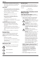 E NG L I S H Labels on Charger and Battery Pack The package contains: In addition to the pictographs used in this manual, the labels on the charger and the battery pack show the following pictographs: 2 Li-Ion battery packs (M2, L2 models, 3.0 ah) 1 Cordless Reciprocating Saw 1 Kitbox 1 Charger Read instruction manual before use. 1 Instruction manual 1 Exploded drawing Charging. x NOTE: Battery packs, chargers and kitboxes are not included with N-models. Fully charged.