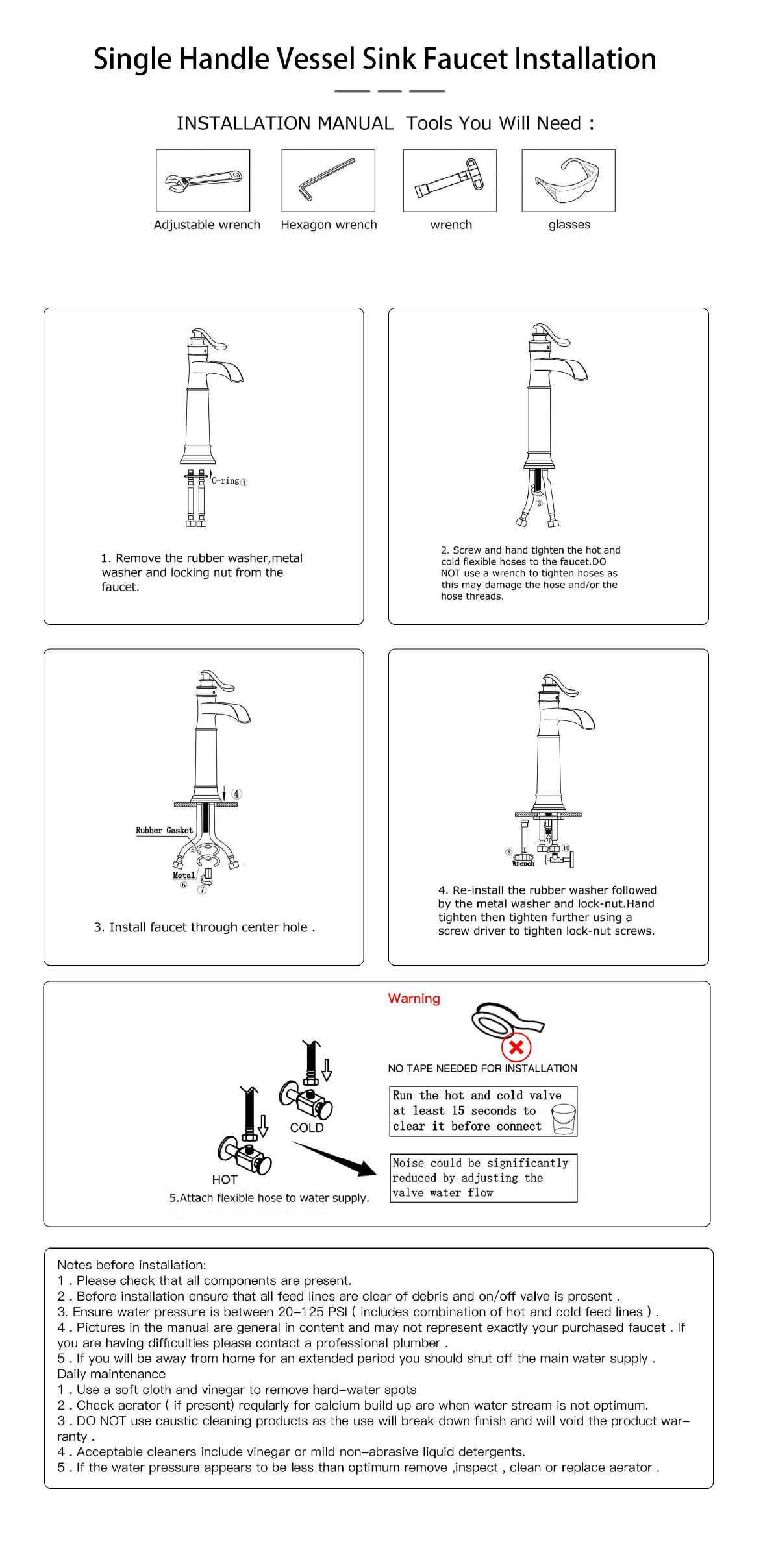 e Vessel S Single Hand ink Faucet Installation INSTALLATION MANUAL. Tools You Will Need : ety ae —— Adjustable wren ssh Halogen wain Wreath glasses cassia 1. Remove the rubber washer, metal vanquisher locking nat from the 2. Resew handstand tighten the hot and cold fallibleness tn the fantastic HOT use a wrench to tauten hoses 2s faucet: His may damage the hose and/or the Hose threads, ig PEE GES 4 asl 3.