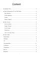 Content z Important Note……………………………………………………………………………3 z Parts & Descriptions Of Your MP4 Player……………………………………………4 Keys Definition……………………………………………………………………………4 Volume Adjusting…………………………………………………………………………5 Screen……………………………………………………………………………………5 Battery Capacity…………………………………………………………………………5 z Main Function…………………………………………………………………………… 6 Enter Into Menu…………………………………………………………………………6 Display Preview………………… ………………………………………………………6 On-Off power……………………………………………………………………………6 Play/Pause…………………………………………………………………………