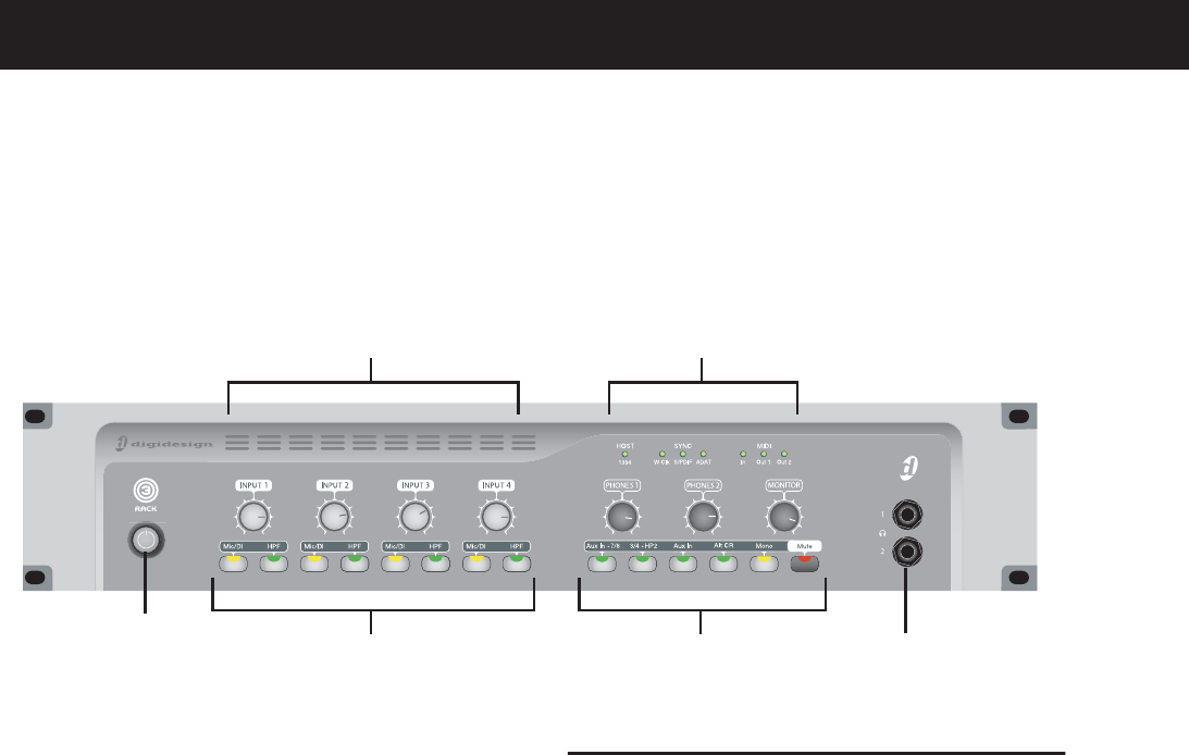 The 003 Rack front panel provides controls for Inputs 1–4, options for routing outputs and monitor-
