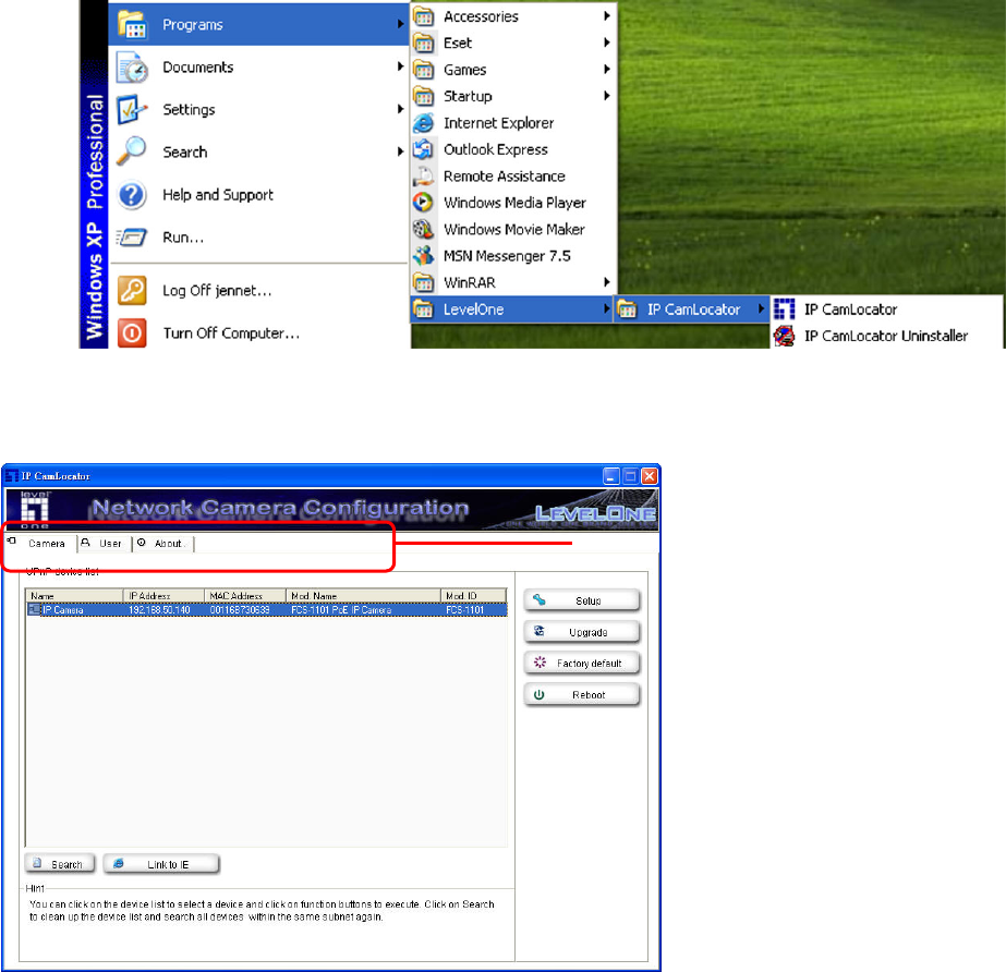 Click Start -> Program Files -> LevelOne -> IP Cam Locator -> IP Cam Locator.