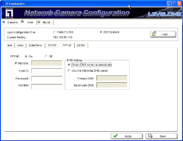 Use this when you connect the camera through PPPoE (Point -to- Point Protocol over Ethernet). PPPoE
