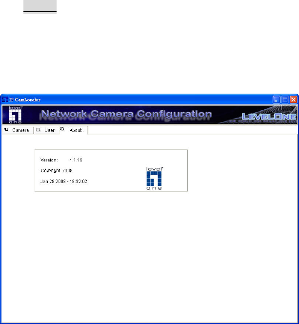 This page displays IP CamLocator information including Version, Copyright and Product Date