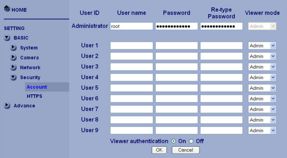 menu to set the user names and passwords of Administrator and up to 9 different users (User 1 to User 9),