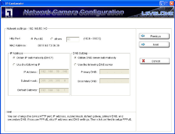 ou can change the network settings of the network camera here. See “Hint” for details.