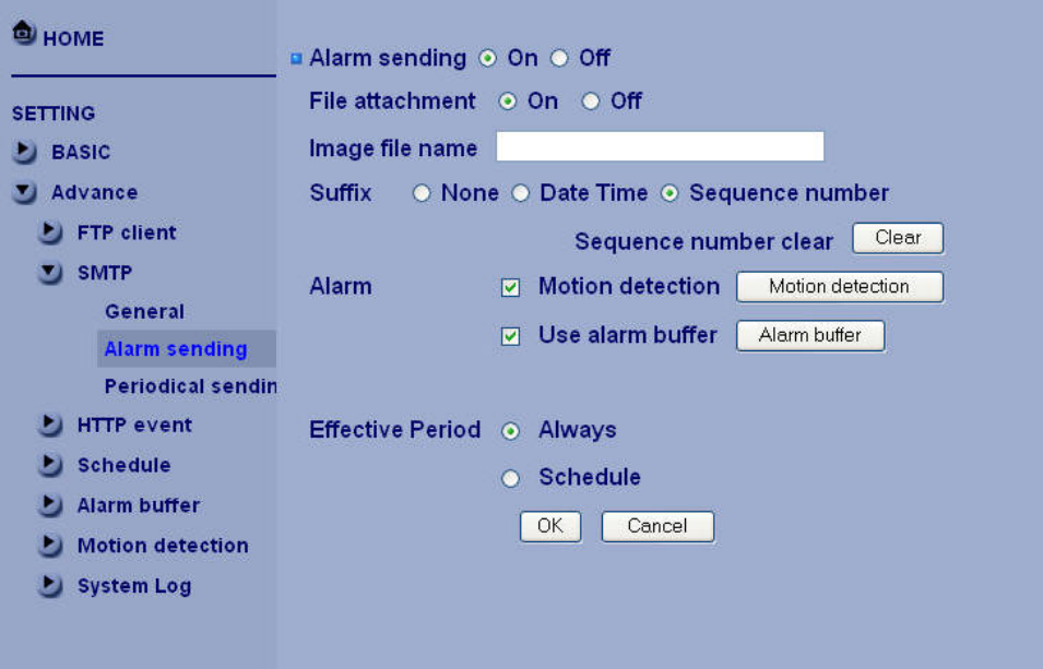 Alarm sending:Select On to set to send mail with connection to the alarm detection.