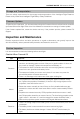 MATRICE 300 RTK Maintenance Manual Screws Landing Gear Base 1. All the screws on the aircraft body are tightened, especially the screws connecting the motor and the carbon tube. 1. Screws are secure. 2. There is no damage or cracks. Frame Arms 1. The 28 screws on the four frame arms are secure. 2. The arm junctions are not damaged or cracked. 3. Grab the carbon tube and shake the arm slightly to check if there is no obvious shake. Frame Arm LEDs 1.