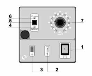 Switch 1 turns power on. Turn knob 7 to increase flow and pump impulses: max flow at 100%.