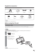 Supplied accessories Make sure the following accessories are provided with the product. Remote control unit (g1) “AA” size manganese battery (g2) Page 9 Screws (g3) Page 7 AC cord (g1) Page 8 Stand (g1) Page 7 Hex key (g1) Page 7 Cleaning cloth (g1) Page 5 Cable Clamp (g1) Page 8 Operation manual (g1) • Always use the AC cord supplied with the TV. Before using the TV unit Attaching the stand • Before attaching (or detaching) the stand, unplug the AC cord from the AC INPUT terminal.