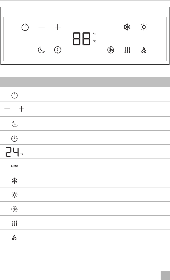 Displays the set temperature and indicates fan level when fan is adjusted.