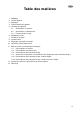 Ta ble des matièr es 1. 2. 3. 4. 5. 6. 7. 8. 9. 10. 11. 12. 13. F Déballage Vue de l'appareil Nettoyage Positionnement de l'appareil Utilisation de l'appareil 5.1 Alimentation sur secteur 5.2 Alimentation sur batterie auto 5.3 Fonctionnement au gaz Montage des roues Production de glace Conseils utiles Dégivrage, nettoyage et entretien Garantie et service après-vente Mise en service, caractéristiques techniques 11.1 Raccordement au secteur 11.2 Raccordement sur batterie auto 11.