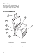 1. Unpacking After removal from the cardboard packaging, make sure the appliance is not damaged. If you find damage to the appliance resulting from transport, report it immediately to the transportation firm. 2. View of the appliance 3 5 2 4 8 6 1 7 Figure 1. 4 1. Insulated casing 5. Evaporator panel 2. Insulated lid 6. Rear cover 3. Pull handle 7. Wheels 4. Control panel 8.