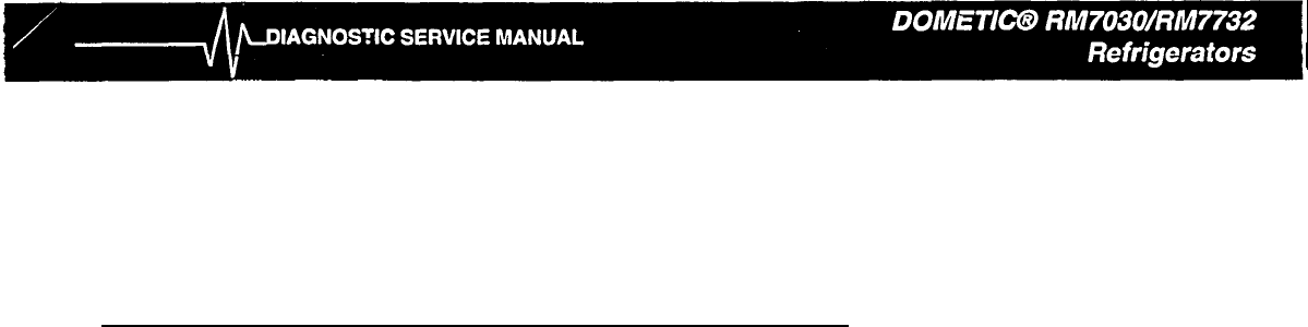 DIAGNOSTIC SERVICE MANUAL CONTENTS DOMETIC® RM7030/RM7732 Refrigerators PAGE NO. RM7030/RM7732 DIAGNOSTIC FLOW CHART ........................... 1 SECTION 1 OPERATION 1.1 RM7030 (Prod. #921890201 & 921890301) Refrigerator Operation .......................................................... 5 1.2 RM7030 (Prod. #921890401) Refrigerator Operation ................ 6 1.3 RM7732 Refrigerator Operation ............................................. 7 SECTION 2 AC VOLTAGE AC Voltage Requirements ............
