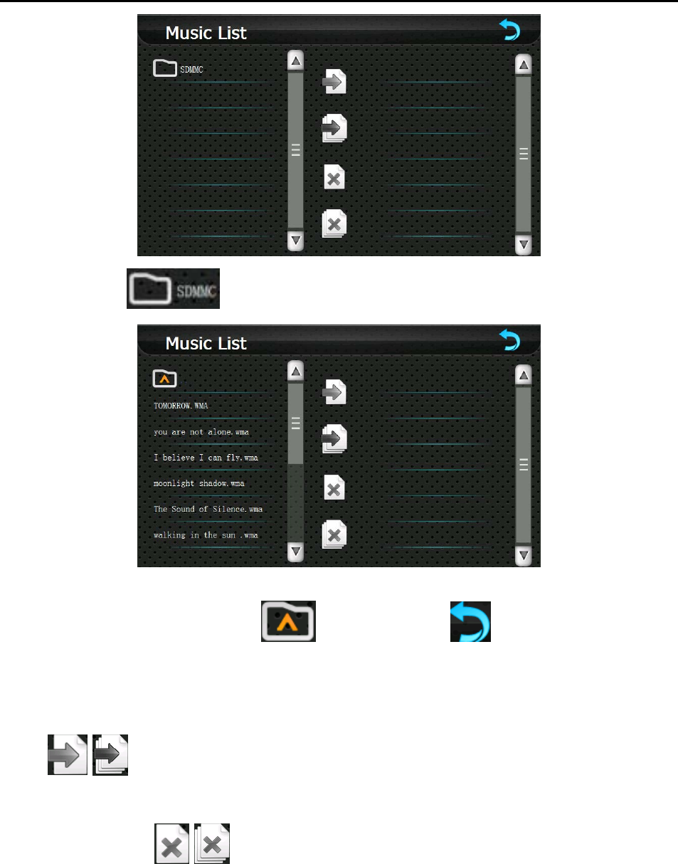 Play interface; drag the scroll bar upward/ downward to view all music files; tap the